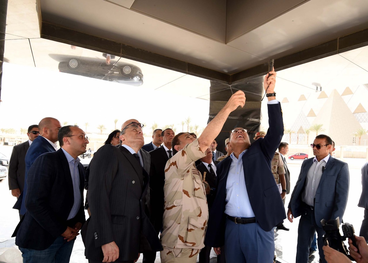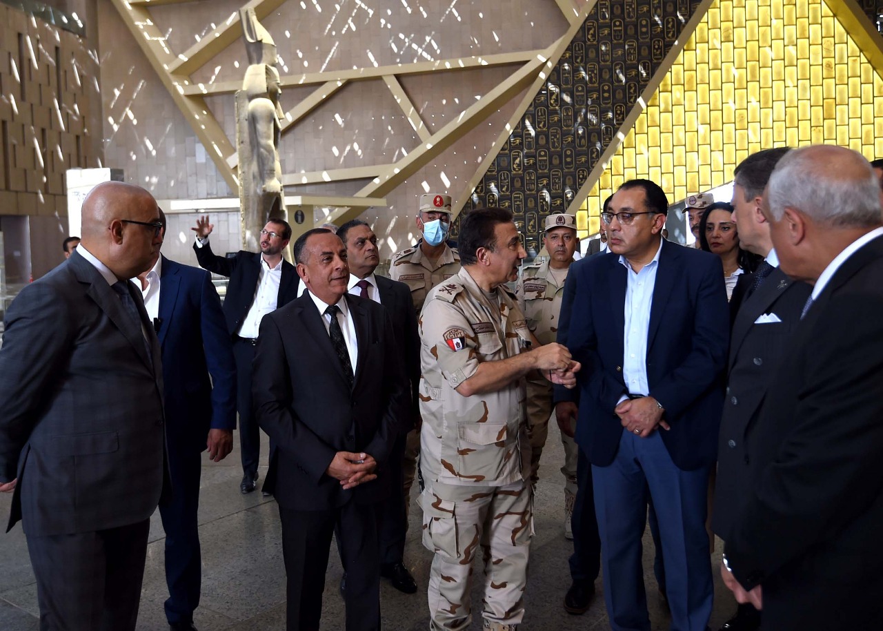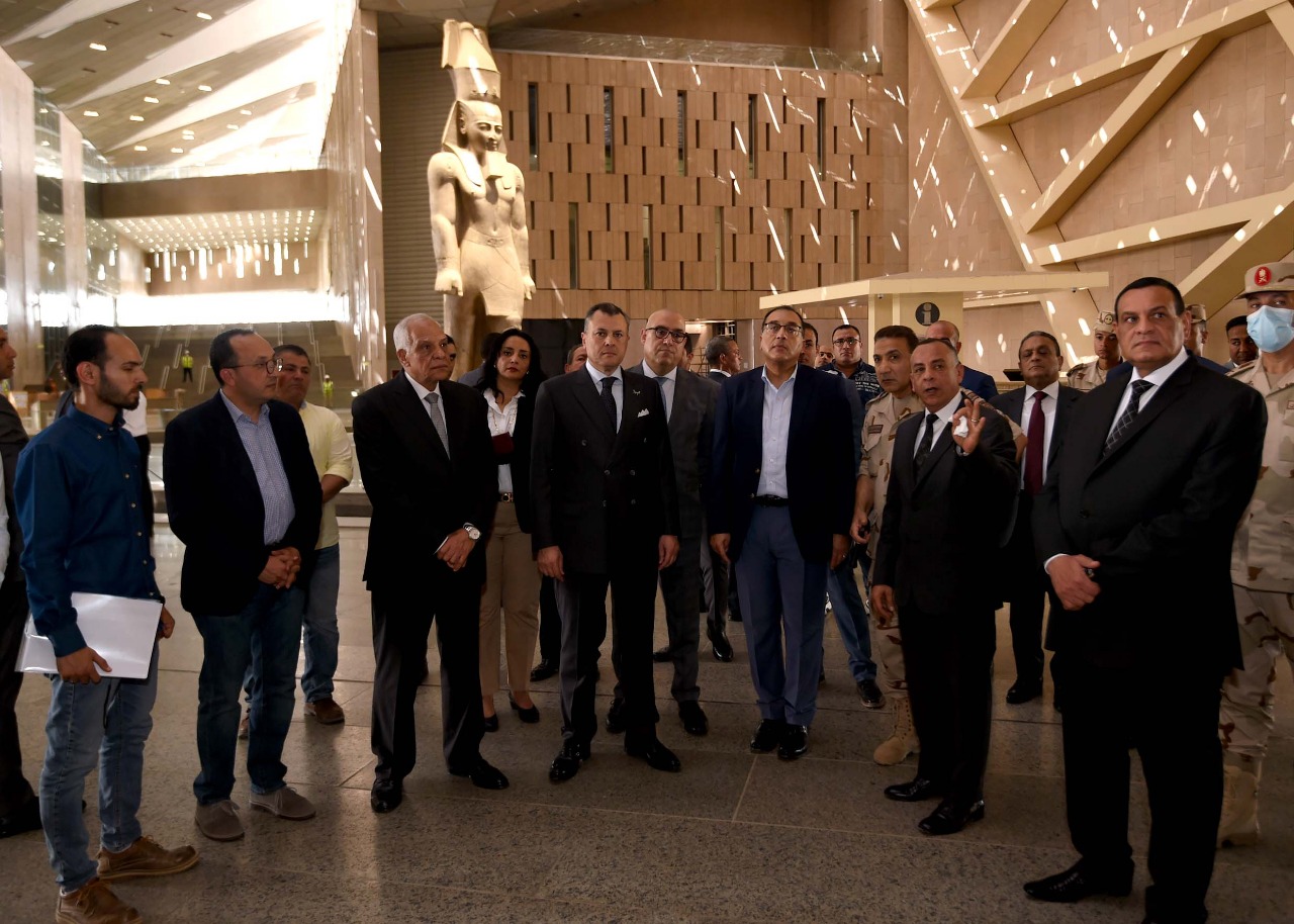 أجرى الدكتور مصطفى مدبولي، رئيس مجلس الوزراء، ظهر اليوم، جولة بالمتحف المصري الكبير؛ لمتابعة آخر مستجدات سير الأعمال به، يرافقه كل من الدكتور عاصم الجزار، وزير الإسكان والمرافق والمجتمعات العمرانية، واللواء هشام آمنة، وزير التنمية المحلية، وأحمد عيسى، وزير السياحة والآثار، واللواء أحمد راشد، محافظ الجيزة، وغادة شلبي، نائب وزير السياحة والآثار لشئون السياحة، واللواء عاطف مفتاح المُشرف العام على المتحف والمنطقة المحيطة به، والدكتور مصطفى وزيري، الأمين العام للمجلس الأعلى للآثار، واللواء هاني مصطفى، مساعد رئيس الهيئة الهندسية للقوات المسلحة، والدكتور عبد الخالق إبراهيم، مساعد وزير الإسكان للشئون الفنية، والدكتور الطيب عباس، مساعد وزير السياحة للشئون الأثرية بالمتحف، وعدد من مسئولي الوزارات والجهات المعنية، وقيادات ومسئولي المتحف، وممثلي الشركات المنفذة للمشروع والمشغلة للخدمات به.