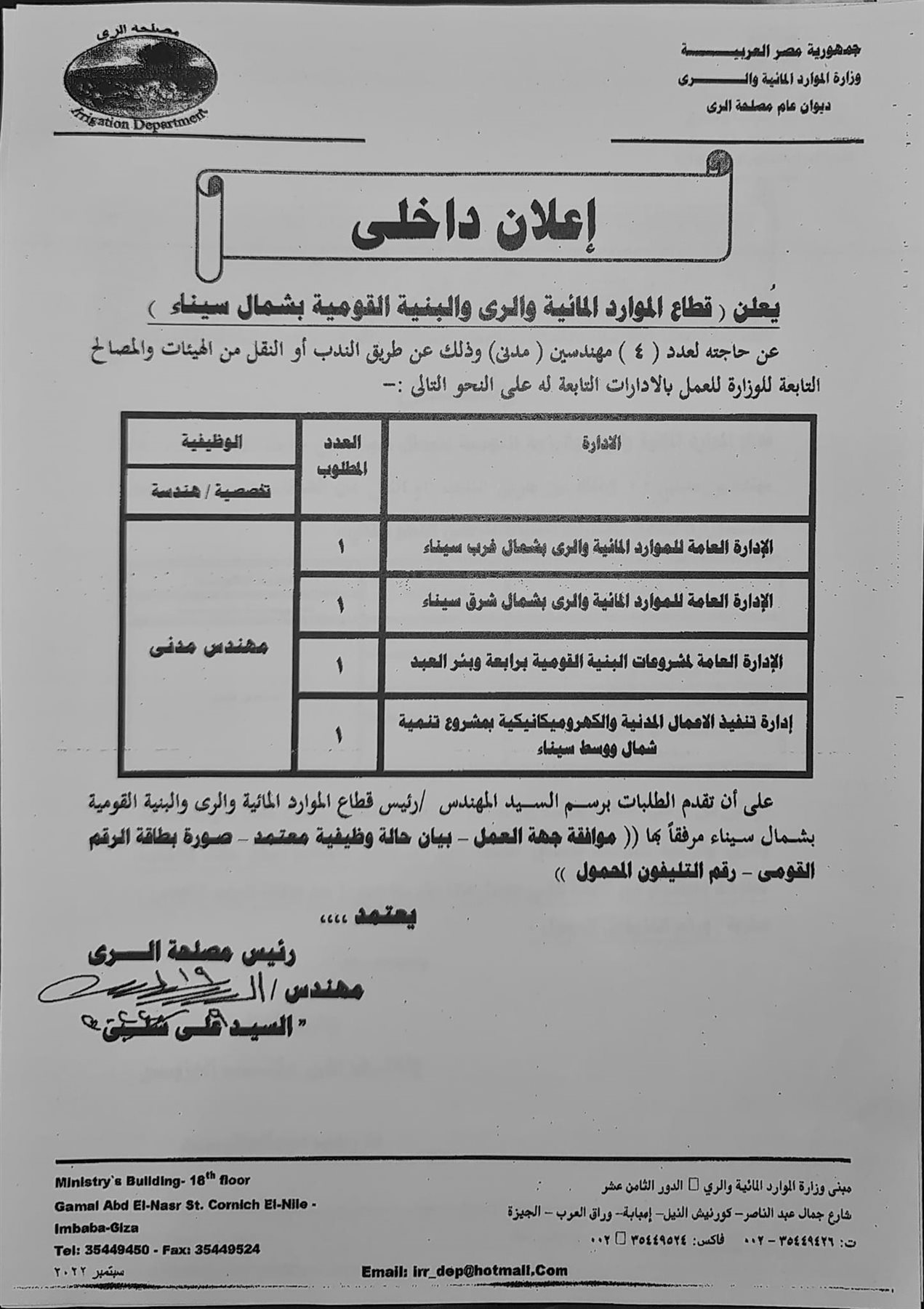 الري تعلن حاجتها لـ4 مهندسين في قطاع الوزارة بشمال سيناء