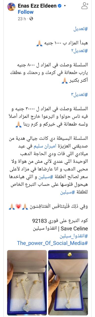 وأعلنت فيما بعد: السلسلة وصلت في المزاد إلى 30 ألف جنيه وفيه ناس حولوا واتبرعوا خارج المزاد أصلًا ولسه طمعانة في خيركم وكرم ربنا.