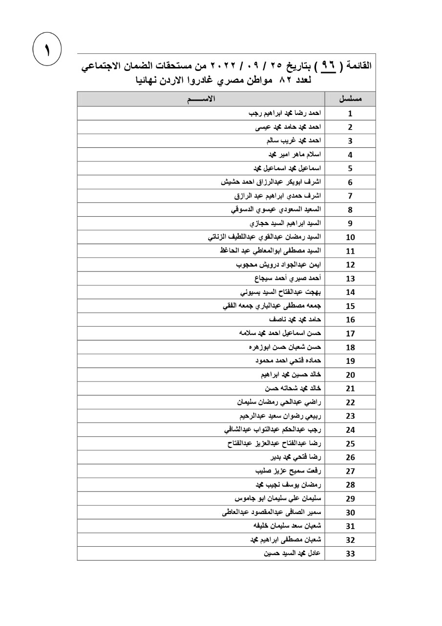 وأضاف الملحق العمالي انه طبقا لإجراءات المؤسسة العامة للضمان الاجتماعي بالأردن، سيتم استرجاع المبالغ غير المصروفة بعد مرور 50 يوما من تاريخ الإعلان عن تحويل المستحقات، مشيرا إلى انه يتم بشكل مستمر التنسيق والتجهيز لإرسال باقي الدفعات لمستحقيها تباعا، فور تدقيقها من الجهات المعنية حفاظا على حقوق المواطنين المستحقين لهذه الدفعات...وتضم القائمة الجديدة الاسماء المرفقة مع هذا البيان الصحفي.