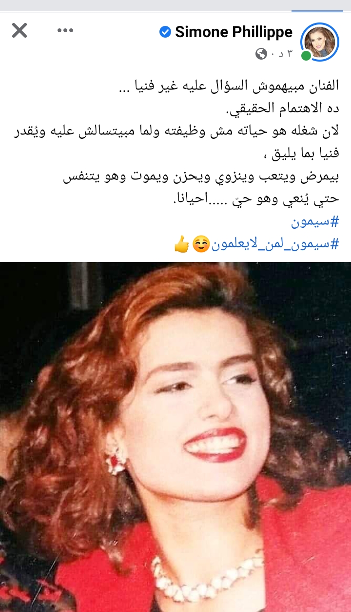 وكتبت سيمون، منشورًا عبر حسابها الشخصي بموقع فيسبوك، جاء فيه: الفنان مبيهموش السؤال عليه غير فنيا، ده الاهتمام الحقيقي.