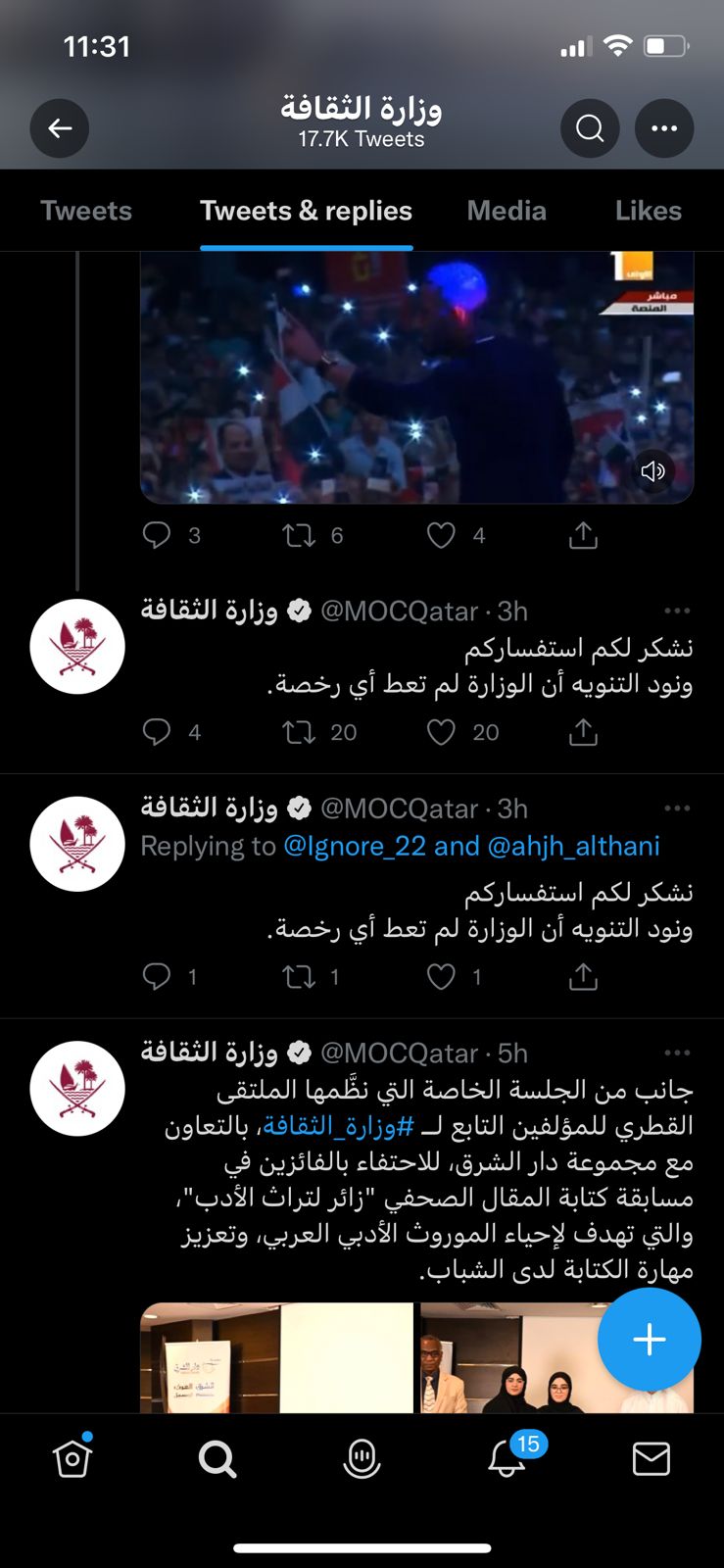 وكتب الحساب الرسمي لوزارة الثقافة القطرية، عبر تويتر، ردًا على استفسارات الجمهور بشأن إقامة حفل لمحمد رمضان: نود التنبيه أن الوزارة لم تعط أي رخصة لإقامة الحفل.