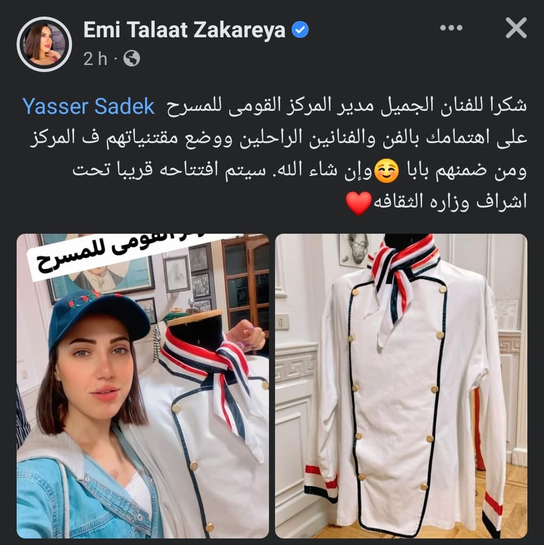 وشاركت إيمي طلعت زكريا، صورة بدلة والدها التي كان يرتديها في فيلم طباخ الريس، وعلقت عليها قائلة: شكرًا للفنان الجميل مدير المركز القومي للمسرح ياسر صادق، على اهتمامك بالفن والفنانين الراحلين ووضع مقتنياتهم في المركز ومن ضمنهم بابا.