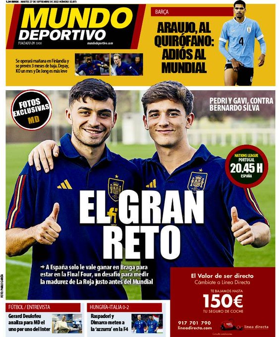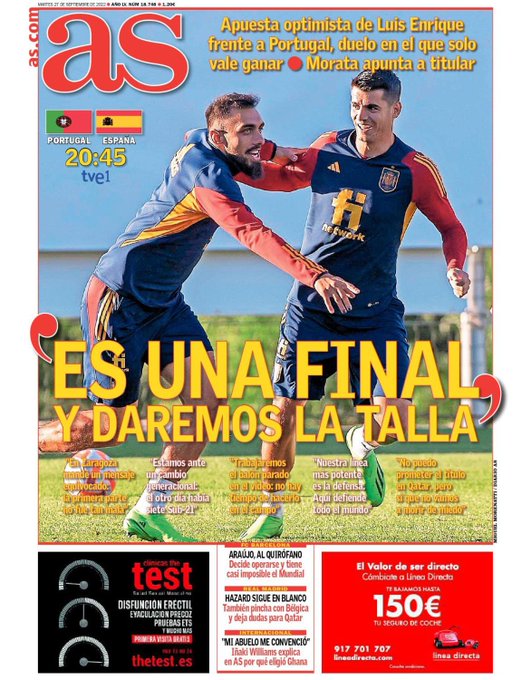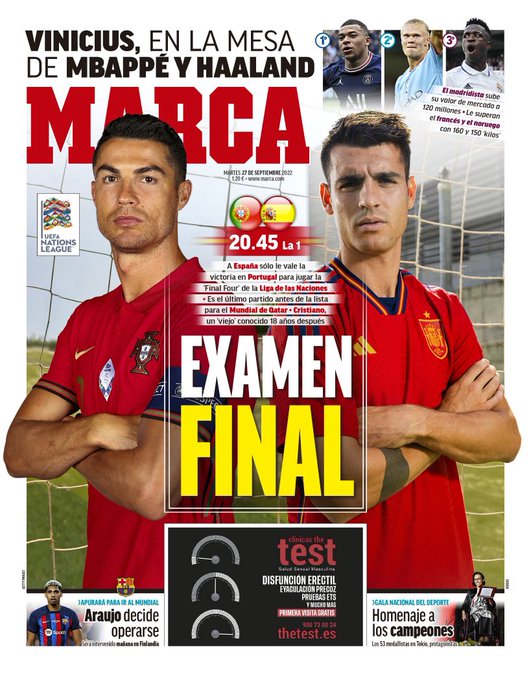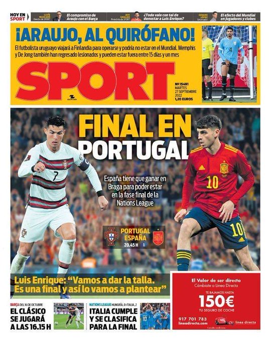 وأشارت سبورت في غلافها إلى أن مواجهة إسبانيا والبرتغال في دوري الأمم الأوروبية اليوم بمثابة نهائي مبكر، حيث يسعى المنتخبان من أجل اقتناص بطاقة التأهل إلى نصف النهائي.