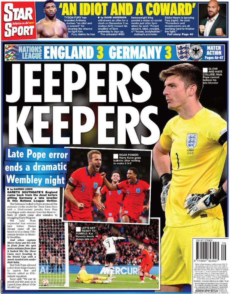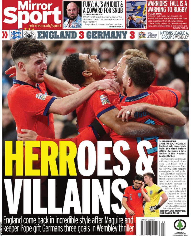 عنونت صحيفة ميرور في غلافها اليوم بـ إنجلترا تحقق ريمونتادا درامية أمام ألمانيا في ملعب ويمبلي، ولكن بوب أهدى الألمان الفوز بخطأه.