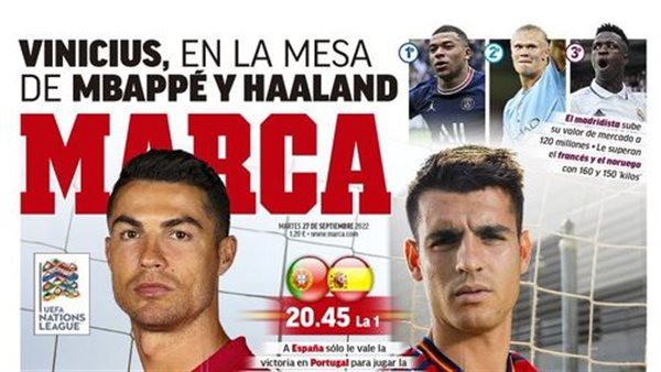 قالت ماركا في غلافها إن فينيسيوس جونيور لاعب فريق ريال مدريد بدأ يلاحق الثنائي كيليان مبابي وإيرلينج هالاند في صراع القيمة التسويقية، وذلك بعد أن وصلت قيمته إلى 120 مليون يورو، بفارق 30 مليون فقط عنهما.