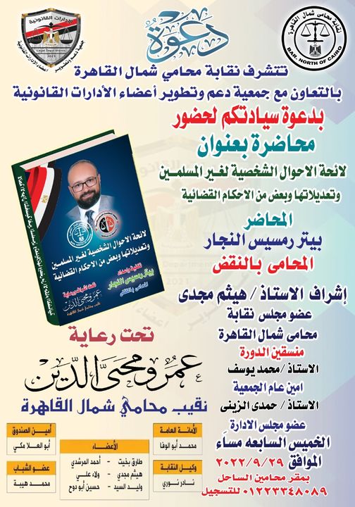 تعقد نقابة شمال القاهرة ندوة قانونية تثقيفية لشباب المحامين، يوم الخميس 29 سبتمبر المقبل حول لائحة الأحوال الشخصية لغير المسلمين وتعديلاتها وبعض من الأحكام القضائية، ويحاضر بالندوة بيتر رمسيس النجار المحامي بالنقض، وذلك بالتعاون مع جمعية دعم وتطوير أعضاء الإدارات القانونية، وتعقد الندوة بمقر محامي الساحل.