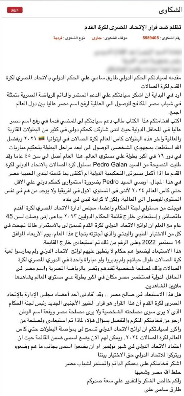 وتساءل الحكم الدولي: هل هذا الاستبعاد في صالح مصر، وقد أفادني أحد أعضاء مجلس الإدارة بالإتحاد المصرى لكرة القدم أن هذا القرار هو قرار الخبير الأجنبي الجديد رئيس لجنة الحكام الذي لا يرى سوى مصلحته الشخصية، ولا يرى مصلحة مصر ورفعة اسم الوطن، أرجو من فخامتكم التكرم والتفضل بسؤال هؤلاء لماذا تم استبعادي ولمصلحة من وأكرر لسيادتكم أن لوائح الاتحاد الدولي تسمح لي بمواصلة البطولات حتي كاس العالم لكرة الصالات 2024.