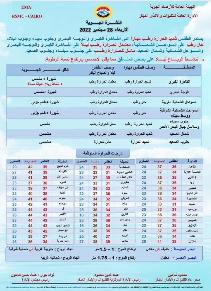 ومن المتوقع أن يسود طقس شديد الحرارة رطب خلال فترات النهار على القاهرة الكبرى والوجه البحري، وجنوب سيناء وجنوب البلاد، ويصبح حارا رطبا على السواحل الشمالية.