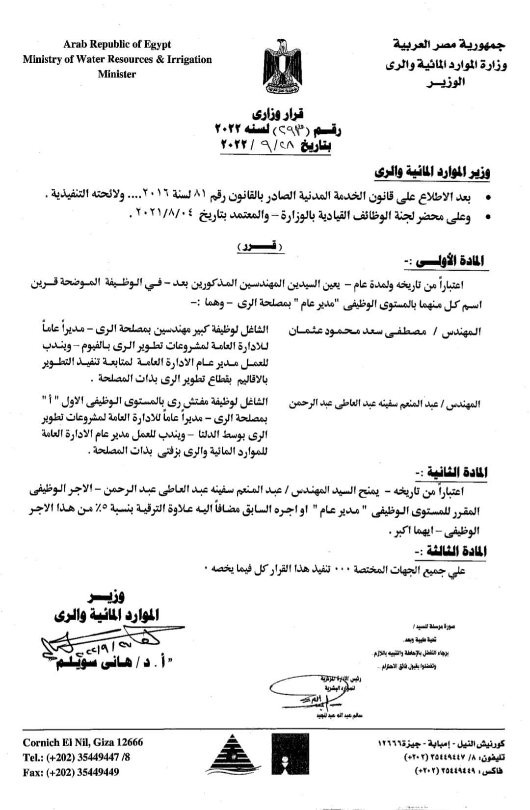وأكد مستند صادر من وزارة الري أنه بعد الاطلاع على قانون الخدمة المدنية الصادر بالقانون رقم 81 لسنة 2016، ولائحته التنفيذية، وعلى محضر لجنة الوظائف القيادية بالوزارة، فإنه اعتبارًا من تاريخه ولمدة عام يعين المهندسين المذكورين في الوظيفة الموضحة تحت اسم المستوى الوظيفي "مدير عام " بمصلحة الري - وهما: