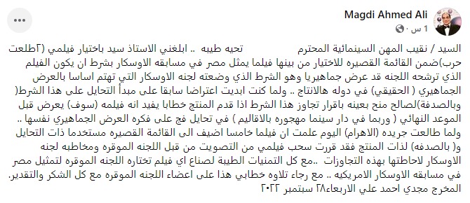 وأنهى مجدى أحمد على حديثه، قائلًا: مع كل التمنيات الطيبة لصناع أي فيلم تختاره اللجنة الموقرة لتمثيل مصر في مسابقه الأوسكار الأمريكية.. مع رجاء تلاوة خطابي هذا على أعضاء اللجنة الموقرة مع كل الشكر والتقدير.