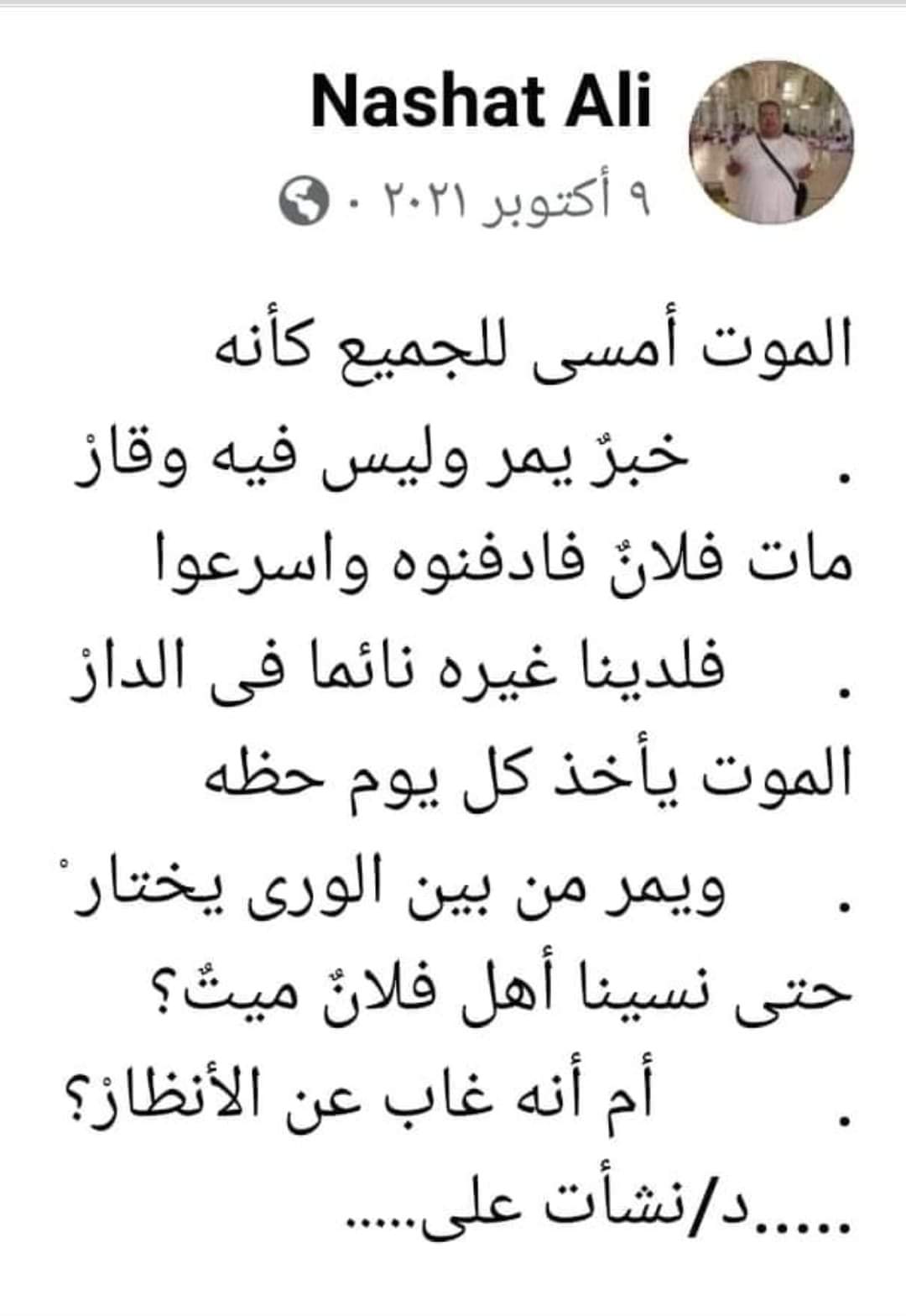 ونشر الدكتور نشأت علي على صفحته الشخصية فيسبوك قبل وفاته بأيام قائلا: يارب وجهت وجهي نحو بابك راجيا والحال لا يخفى وأنت عليم.