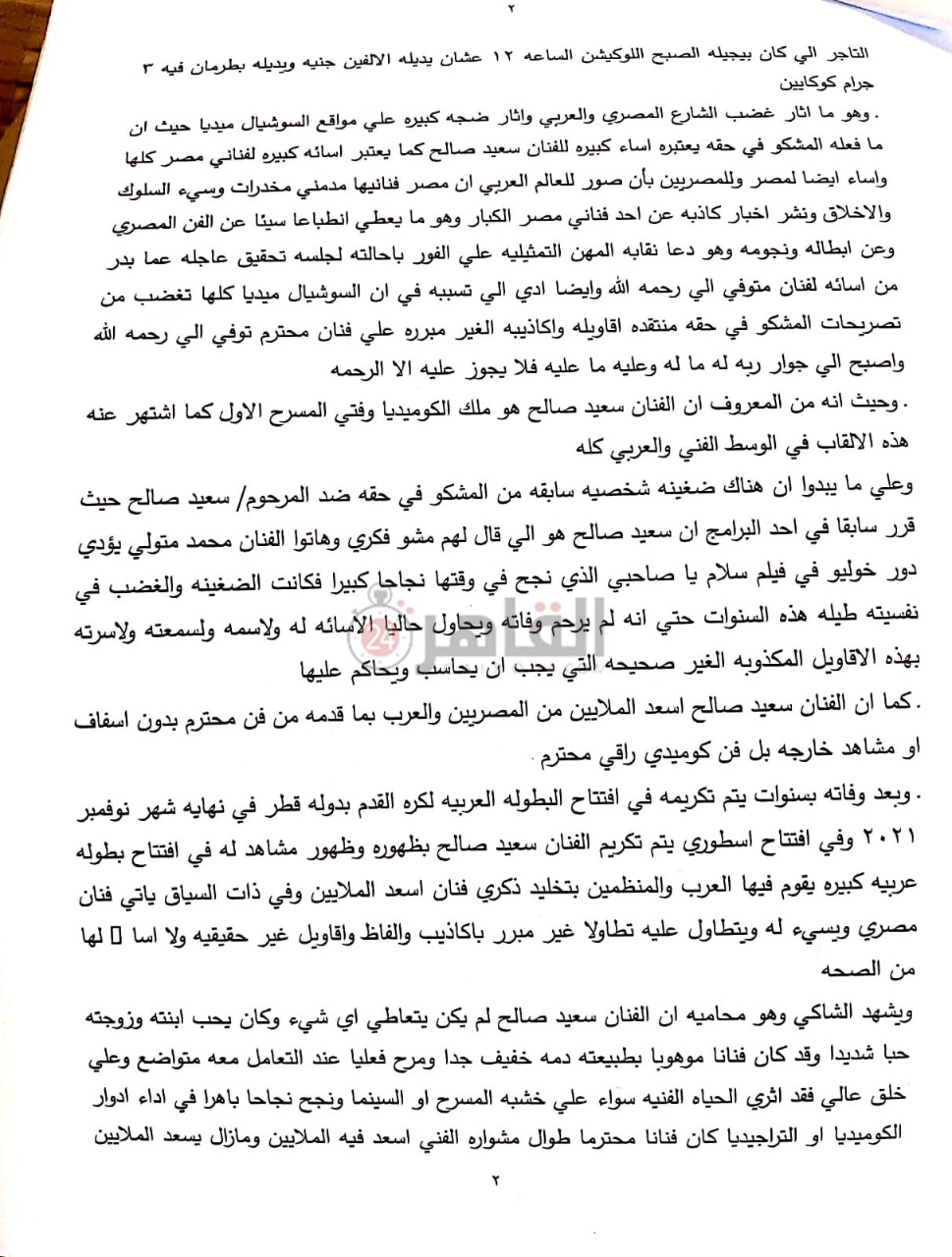وأضاف البيان: وحيث تمثل أقوال المشكو في حقه سب وقذف وتشهير وألفاظ خادشة لسمعة وشرف العائلات، وأخبار كاذبة عن فنان مصري محترم، حيث جاءت أقواله المشكو في حقه على النحو الآتي: سعيد صالح مش قدوة، عاشرنا بعض واحنا مش لاقيين ناكل من سنة 64، سعيد صالح قدوة سيئة للممثل، سعيد صالح دخل السجن سجل إللي أنا بقوله لك ده سجله عشان يتحسب عليا.. أنا لسه هقول ده في برنامج تاني مع عمرو الليثي، سعيد صالح بيحب المخدرات أكتر ما بيحب بنته وده اتقال من أعظم ممثلين مصر، سعيد صالح لا يملك من الإنسانية أي قدر ضئيل، سعيد صالح لا يملك من الذكاء أي قدر ضئيل.
