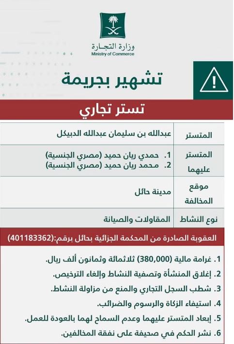 ونشرت وزارة التجارة السعودية، الحكم القضائي الصادر من المحكمة الجزائية بحائل المتضمن تغريم المخالفين بمبلغ قدره 380 ألف ريال والتشهير بهم، وإغلاق المنشأتين وتصفية نشاطهما وإلغاء التراخيص وشطب السجل التجاري والمنع من مزاولة النشاط، واستيفاء الزكاة والرسوم والضرائب، وإبعاد المقيمين المتستر عليهما عن المملكة وعدم السماح لهما بالعودة للعمل.