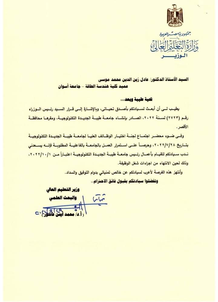 وزير التعليم العالي يصدر قرارًا بندب عادل زين رئيسا لـ جامعة طيبة التكنولوجية | مستند