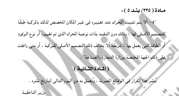كذلك نصت اللائحة التنفيذية للمرور: ألا يتم تثبيت المحرك عند تغييره في غير المكان المخصص لذلك بالمركبة طبقا للتصميم الأصلي لها، وذلك دون التقيد بذات نوعية المحرك الذي تم تغييره أو نوع الوقود أو الطاقة التي يعمل بها، شريطة ألا يخالف ذلك التصميم الأصلي للمركبة، أو متى وافقت على ذلك الجهة المختصة بوزارة التجارة والصناعة.