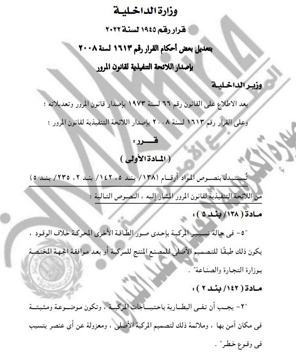 نصت المادة الأولى في اللائحة: تبدل بنصوص المواد أرقام (138/ بند 5، 142/ بند 2، 235/ بند 5) من اللائحة التنفيذية لقانون المرور المشار إليه، النصوص التالية: مادة ( 138/ بند5، أنه في حالة تسيير المركبة بإحدى صور الطاقة الأخرى المحركة خلاف الوقود، يكون ذلك طبقا للتصميم الأصلي للمصنع المنتج للمركبة أو بعد موافقة الجهة المختصة بوزارة التجارة والصناعة، ويجب أن تفي البطارية باحتياجات المركبة، وتكون موضوعة ومثبتة في مكان آمن بها، وملائمة ذلك التصميم المركبة الأصلي، ومعزولة عن أي عنصر بتسبب في وقوع خطر.