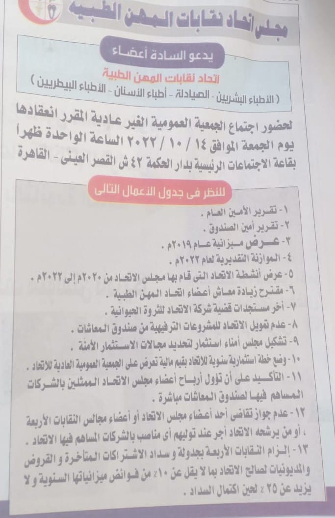 وأضاف، أن إعلان مجلس اتحاد المهن الطبية عن عقد الجمعية العمومية يوم الجمعة 14 أكتوبر 2022 بدار الحكمة، أغفل وأسقط بعض الموضوعات الملزم قانونا بإدراجها ضمن جدول الأعمال، حيث نص قانون اتحاد نقابات المهن الطبية رقم 13 لسنة 1989 في المادة الرابعة منه على أنه لكل عضو من أعضاء المهن الطبية حق تقديم أي اقتراح إلى الجمعية العمومية، بشرط أن يقدم الاقتراح عن طريق مجلس النقابة التي ينتمي إليها العضو قبل انعقاد الجمعية العمومية بـ 10 أيام على الأقل.