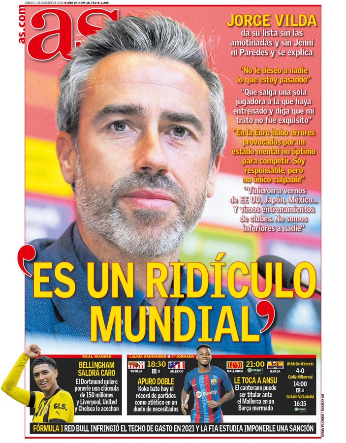 قالت آس في غلافها لعدد اليوم إن تكلفة بيلينجهام ستكون باهظة على ريال مدريد، حيث يطلب بوروسيا دورتموند قرابة الـ 150 مليون يورو من أجل بيعه.