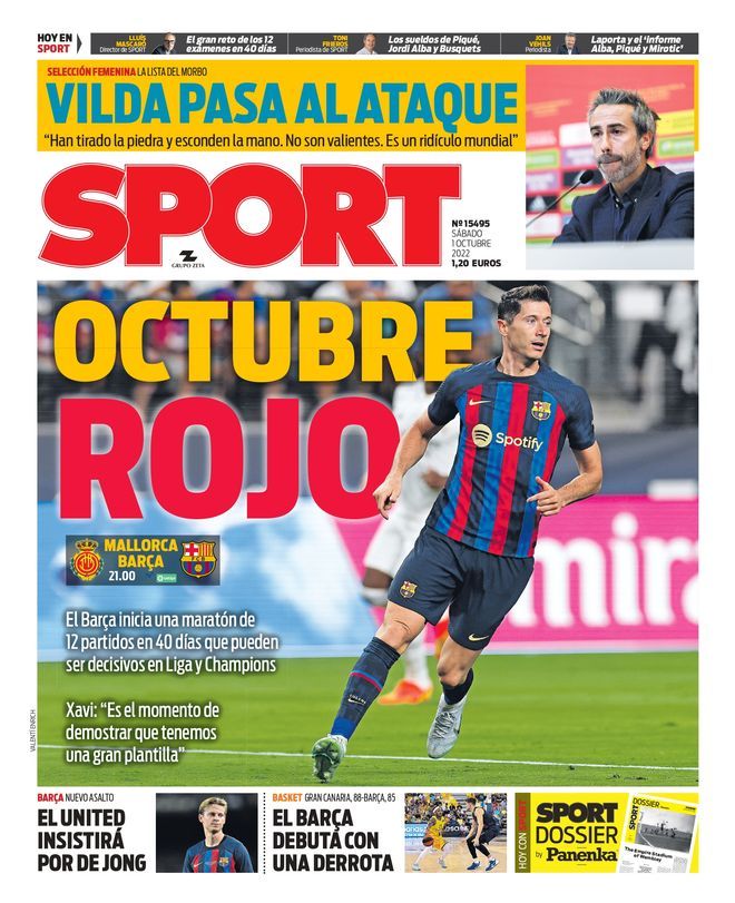عنونت سبورت في غلافها اليوم بـ أكتوبر الأحمر، حيث قالت إن برشلونة سيلعب في أكتوبر 12 مباراة خلال 40 يومًا في الليجا ودوري الأبطال.