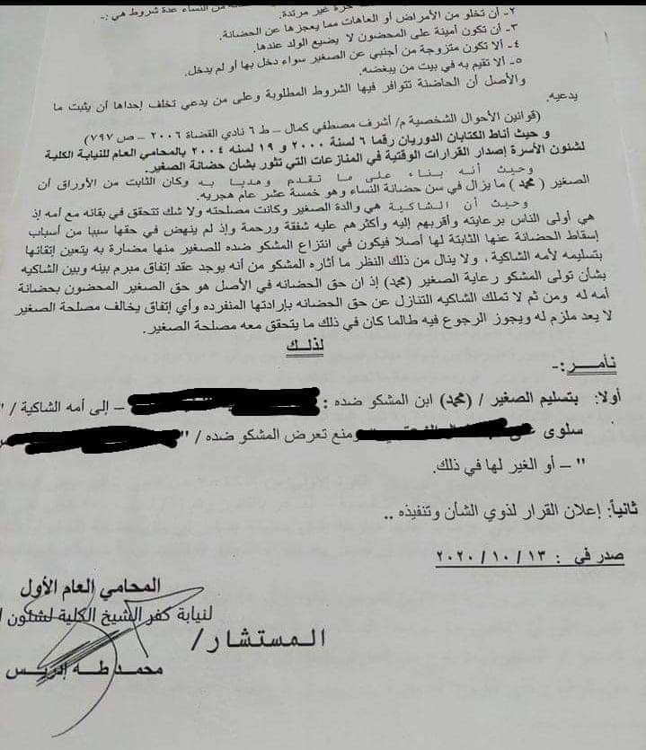 خالف الزوج الاتفاق، والذي نص على وجود الطفل والطفلة معها، قائلة: وقت الجد والأمر الواقع اشترط أنه يأخد مني ابني محمد مقابل أن يطلقني في هدوء ودون مشاكل ومحاكم، وكمان أتنازل عن كل مستحقاتي.