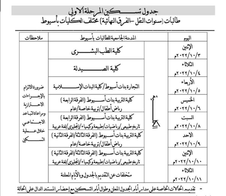 3- يوم الأربعاء الموافق 5 من شهر أكتوبر الجاري تسكين طالبات كلية الطب التجارة بنات بأسيوط، وكلية البنات الإسلامية.