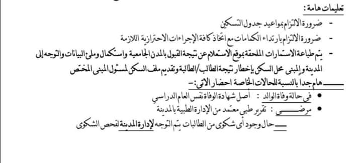 2- يوم الثلاثاء الموافق 4 من شهر أكتوبر الجاري تسكين طالبات كلية الطب الصيدلة.