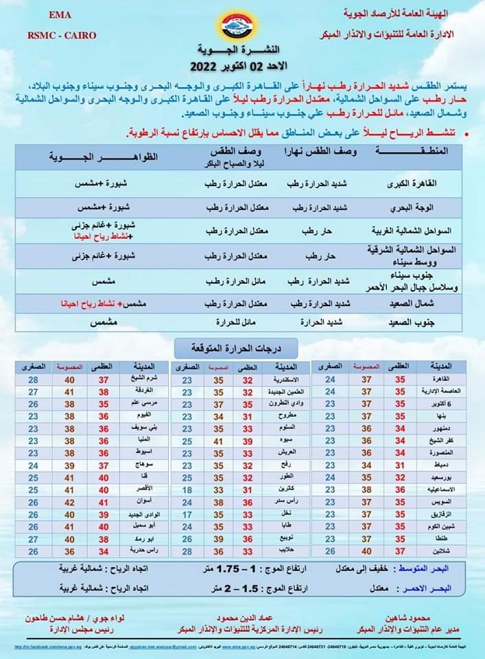 وقالت الأرصاد إن السواحل الشرقية ستشهد طقسا حارا رطبا، معتدل الحرارة رطبا خلال الليل على القاهرة الكبرى، والوجه البحري، والسواحل الشمالية وشمال الصعيد، مائلا للحرارة رطبا على جنوب سيناء، وجنوب الصعيد.