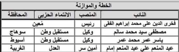 بينما جاء تشكيل لجنة الخطة والموازنة في مجلس النواب، دون تغيير عن دور الانعقاد الثاني، من خلال تواجد النائب فخري الفقيـ على رأس اللجنة، ومصطفى سالم وكيًلا، مع النائب ياسر عمر محمد عمر، فضًلا عن تواجد النائب عبد المنعم إمام أمينا للسر بالجنة.