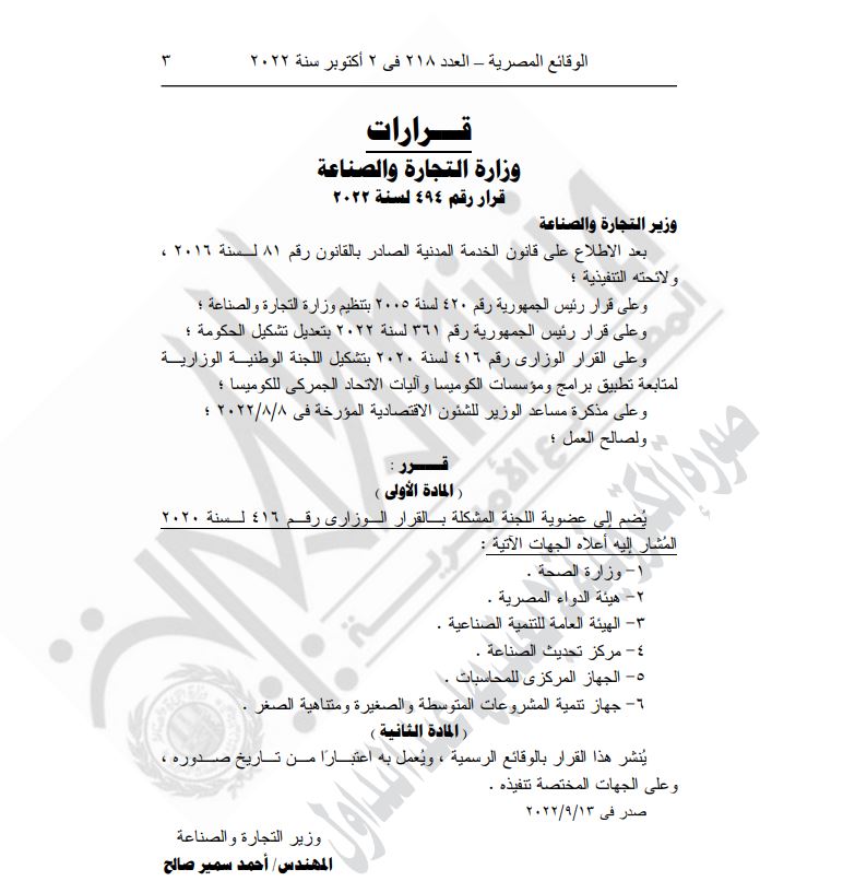 وبحسب ما نشرته الجريدة الرسمية، وحصل القاهرة 24 على نسخة منه، قرر الوزير ضم كل من وزارة الصحة وهيئة الدواء وهيئة التنمية الصناعية ومركز تحديث الصناعة والمركزي للمحاسبات وجهاز تنمية المشروعات، إلى اللجنة الوزارية المذكورة.