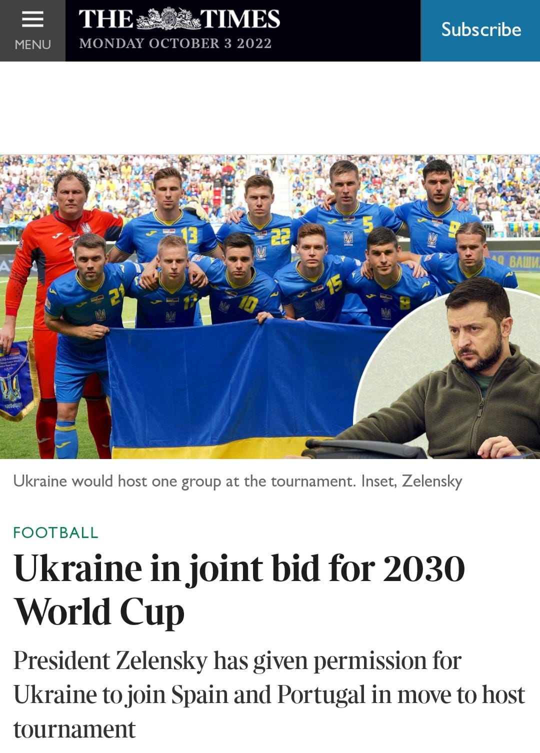 وقالت صحيفة التايمز، إنه من المُقرر أن تكون أوكرانيا مع العرض المشترك لإسبانيا والبرتغال لاستضافة كأس العالم 2030.