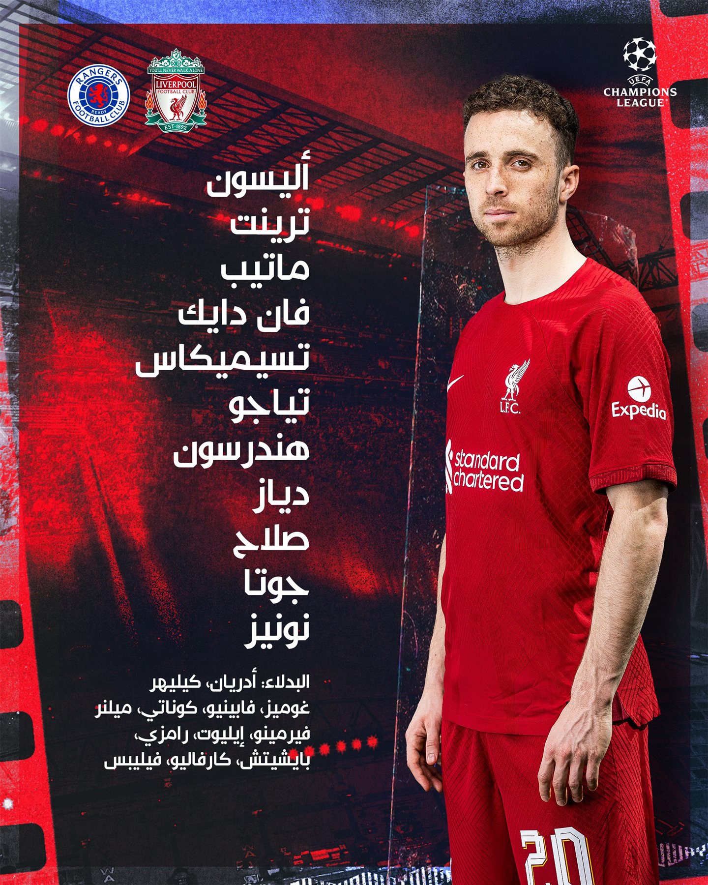 وقرر المدرب الألماني يورجن كلوب، المدير الفني لفريق ليفربول، أن يدخل مباراة فريقه ضد فريق رينجرز بدوري الأبطال، بتشكيل مكون من: -