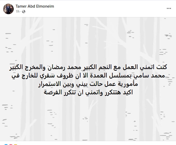 وكتب تامر عبد المنعم، منشورًا عبر حسابه الشخصي بموقع التواصل الاجتماعي فيسبوك، وقال: كنت أتمنى العمل مع النجم الكبير محمد رمضان، والمخرج الكبير محمد سامي بمسلسل العمدة، إلا أن ظروف سفري للخارج في مأمورية عمل، حالت بيني وبين الاستمرار.. أكيد هتتكرر وأتمنى أن تتكرر الفرصة.