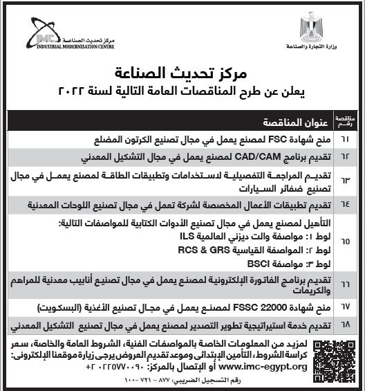 والمشاركة مفتوحة بالمساواة لجميع الهيئات والشركات ذات الصفة القانونية، إذ أن آخر موعد لطلب أي توضيح أو استفسار من مركز تحديث الصناعة 12 - أكتوبر - 2022 على أن تنعقد جلسة الرد على الاستفسارات يوم 13 أكتوبر 2022 في تمام الساعة 12:00 ظهرا.