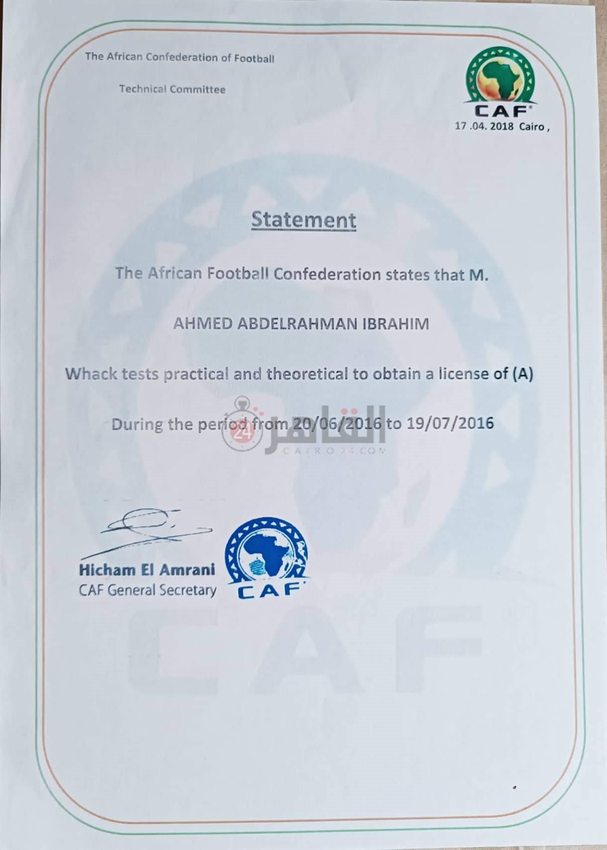 وأضاف عادل: قرار الاتحاد الإفريقي تم إرساله إلى الاتحاد المصري لكرة القدم، بتاريخ 18 يوليو الماضي يفيد بأن أحمد عادل حصل على شهادته التدريبية من بوركينا فاسو، لكنني حصلت على شهادتي من مصر.