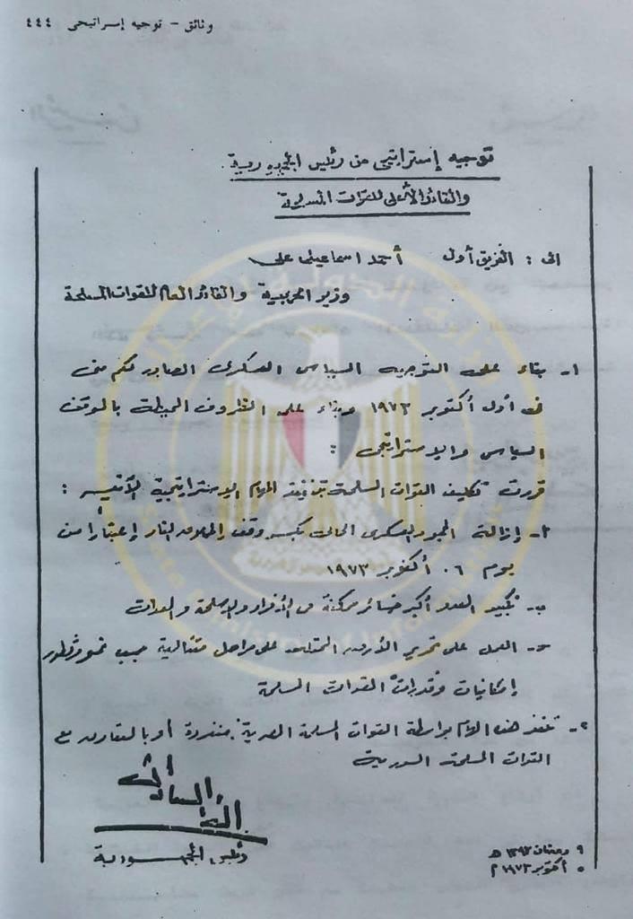 وبمناسبة الذكرى 49 لـ انتصارات أكتوبر، نستعرض تفاصيل قرار الحرب، الذي كتب بخط الرئيس السادات، وجاء في نص القرار: "إلى الفريق أول أحمد إسماعيل وزير الحربية والقائد العام للقوات المسلحة، بناء على التوجيه السياسي العسكري الصادر لكم مني في أول أكتوبر 1973، وبناء على الظروف المحيطة بالموقف السياسي والاستراتيجي قررت تكليف القوات المسلحة بتنفيذ المهام الاستراتيجية الآتية: