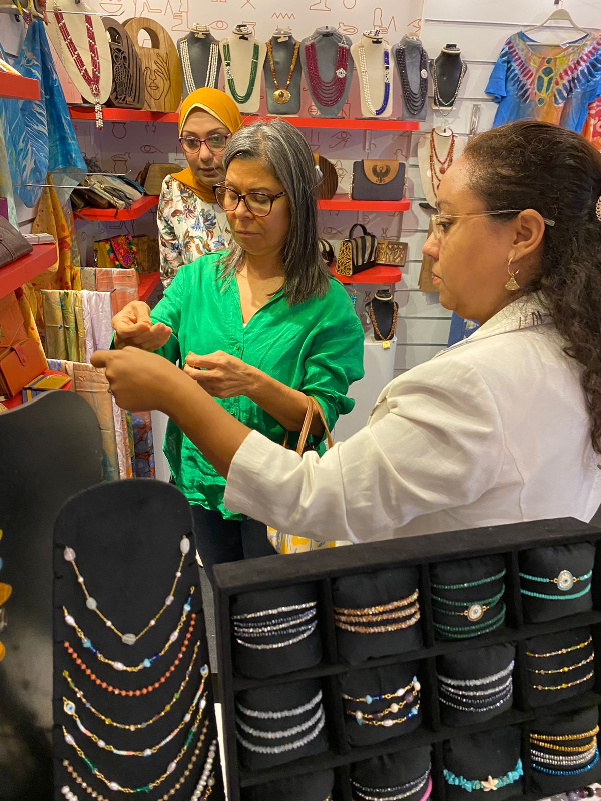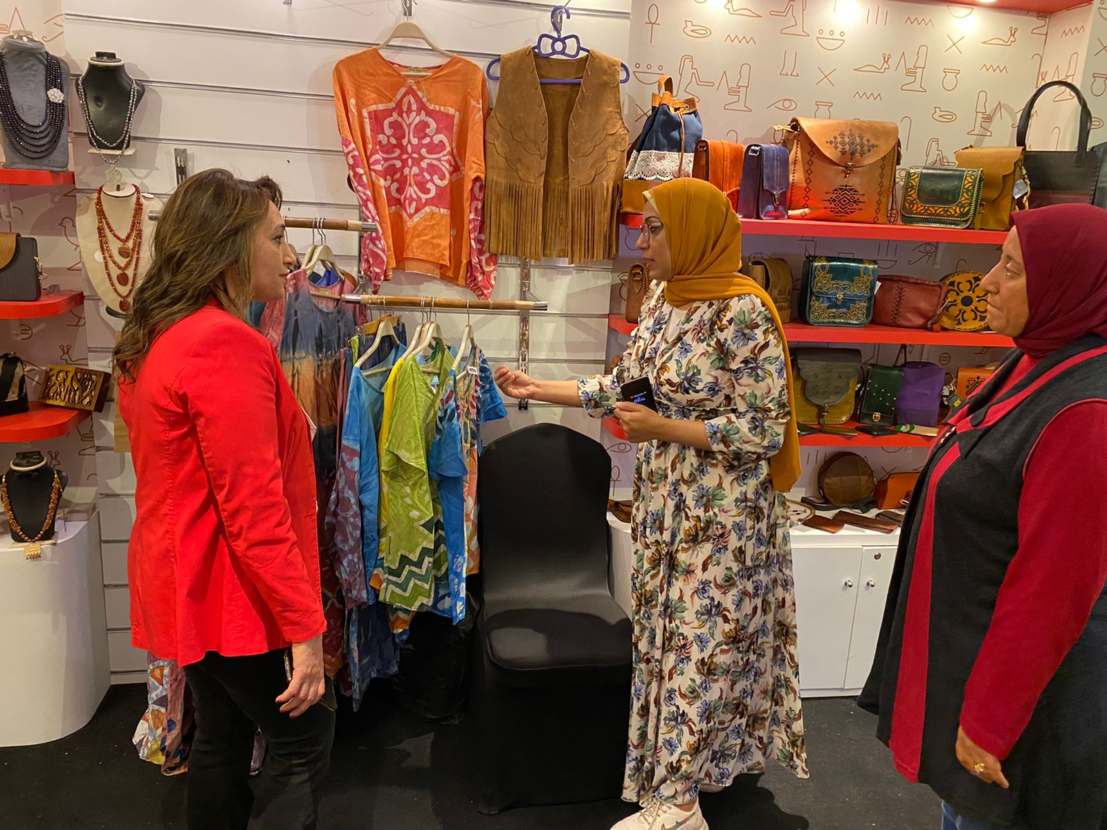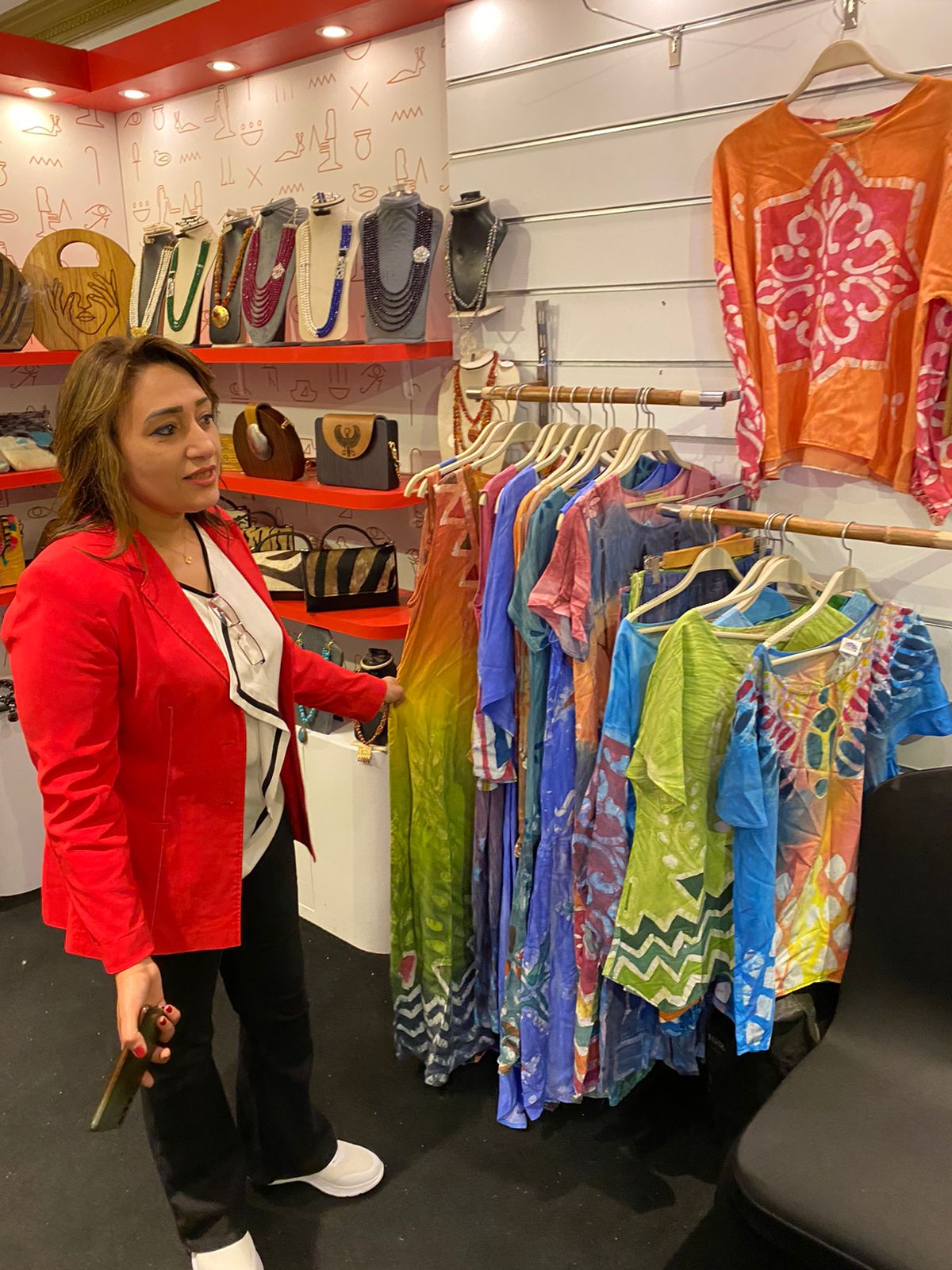 ويضم المعرض ملابس وشيلان ملونة بتقنية الباتيك، وحقائب قماش مطرزة بالغرزة السيناوية والرموز الفرعونية والموتيفات السيوية والنوبية، ومنتجات جلدية من الأحذية والشنط والاكسسوارات والأحزمة، ومنتجات الخوص، وقطع فنية متعددة الاستخدام ملونة بطريقة فن الرسم على الماء، وحُلِي من النحاس مطلية بالذهب والفضة برسوم تراثية فرعونية.