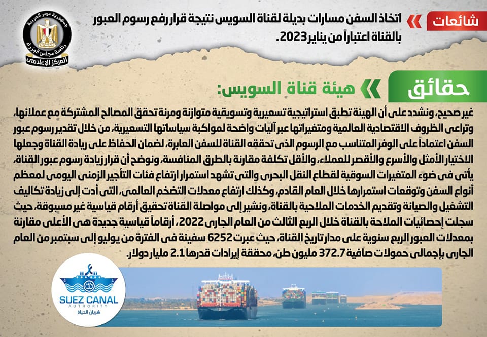 وتواصل المركز الإعلامي لمجلس الوزراء مع هيئة قناة السويس، والتي نفت تلك الأنباء، مُؤكدة أنه لا صحة لاتخاذ السفن مسارات بديلة لقناة السويس نتيجة قرار رفع رسوم العبور بالقناة اعتبارًا من يناير 2023، مُشددة على أن الهيئة تطبق استراتيجية تسعيرية وتسويقية متوازنة ومرنة تحقق المصالح المشتركة مع عملائها، وتراعي الظروف الاقتصادية العالمية ومتغيراتها عبر آليات واضحة لمواكبة سياساتها التسعيرية، من خلال تقدير رسوم عبور السفن اعتمادًا على الوفر المتناسب مع الرسوم الذي تحققه القناة للسفن العابرة؛ لضمان الحفاظ على ريادة القناة وجعلها الاختيار الأمثل والأسرع والأقصر للعملاء، والأقل تكلفة مقارنة بالطرق المنافسة.