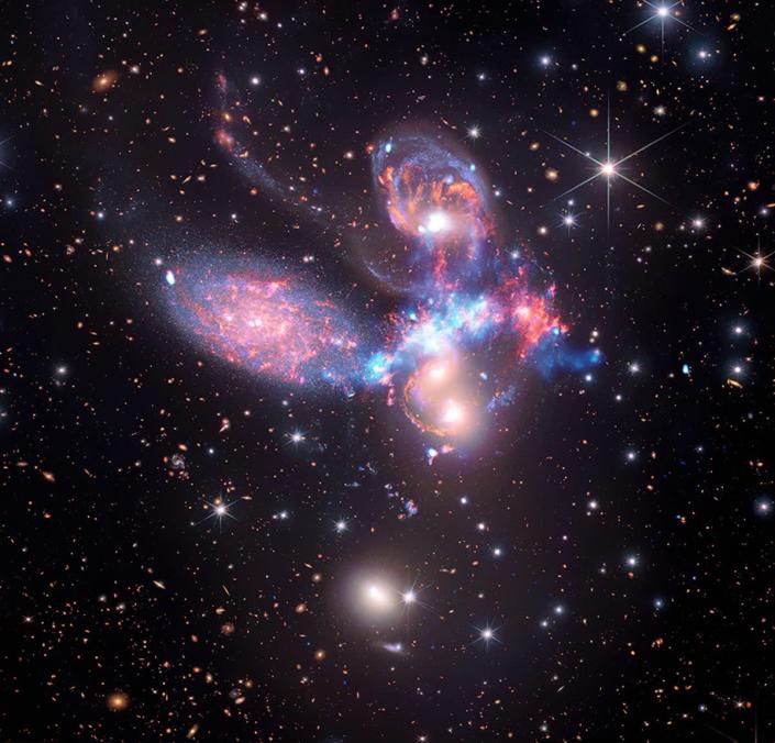 كما أظهرت الصور 4 مجرات تبعد عن الأرض بحوالي 290 مليون سنة ضوئية، بالإضافة إلى مجرة خامسة لامعة، بالإضافة إلى مسار قطري لامع باللون الأزرق وسط المجرات، وشرائط زرقاء حول الأذرع الحلزونية للمجرات.