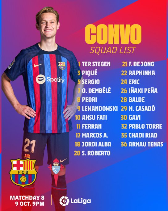 وتأتي قائمة برشلونة لمواجهة فريق سيلتا فيجو، ضمن منافسات مسابقة الدوري الإسباني كما يلي: