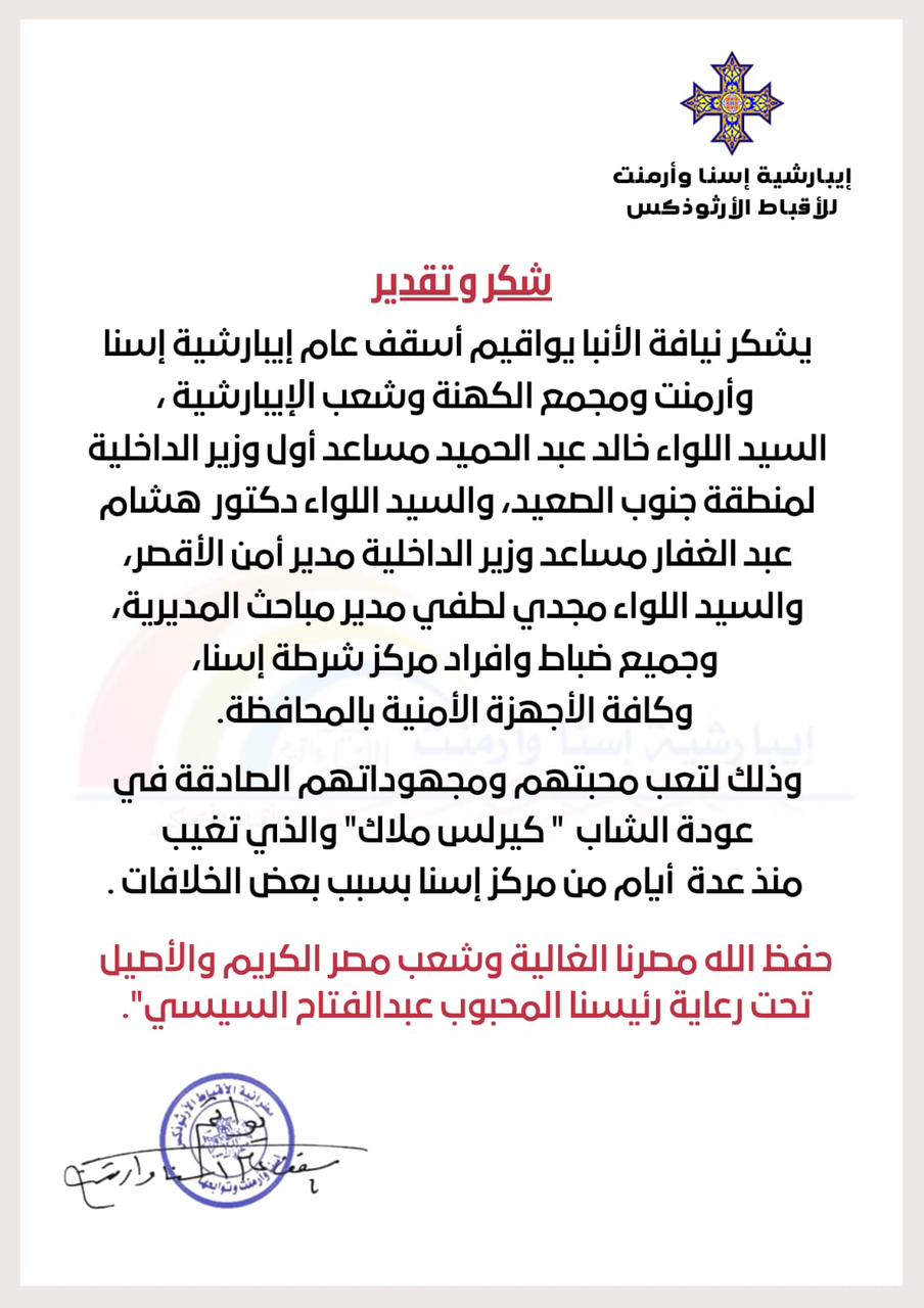 توجه الأنبا يواقيم، أسقف عام إيبارشية إسنا وأرمنت للأقباط الأرثوذكس جنوب محافظة الأقصر، اليوم السبت، بالشكر للجهات الأمنية بمحافظة الأقصر، على جهودها في إعادة الشاب القبطي كيرلس ملاك، بعد تغيبه عن منزله لعدة أيام من مركز إسنا.
