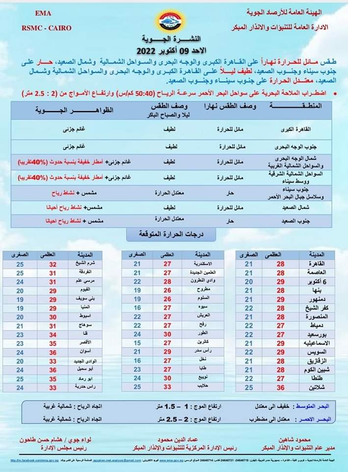 كشفت الهيئة العامة للأرصاد الجوية، تفاصيل حالة الطقس التي تشهدها البلاد خلال يوم غد الأحد، الموافق 9 أكتوبر 2022، محذرة من اضطراب حركة الملاحة.