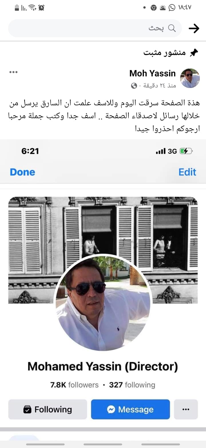 أعلن المخرج محمد ياسين، سرقة حسابه عبر موقع التواصل الاجتماعي فيس بوك، محذرًا أصدقائه ومتابعيه من عدم التعامل معه.
