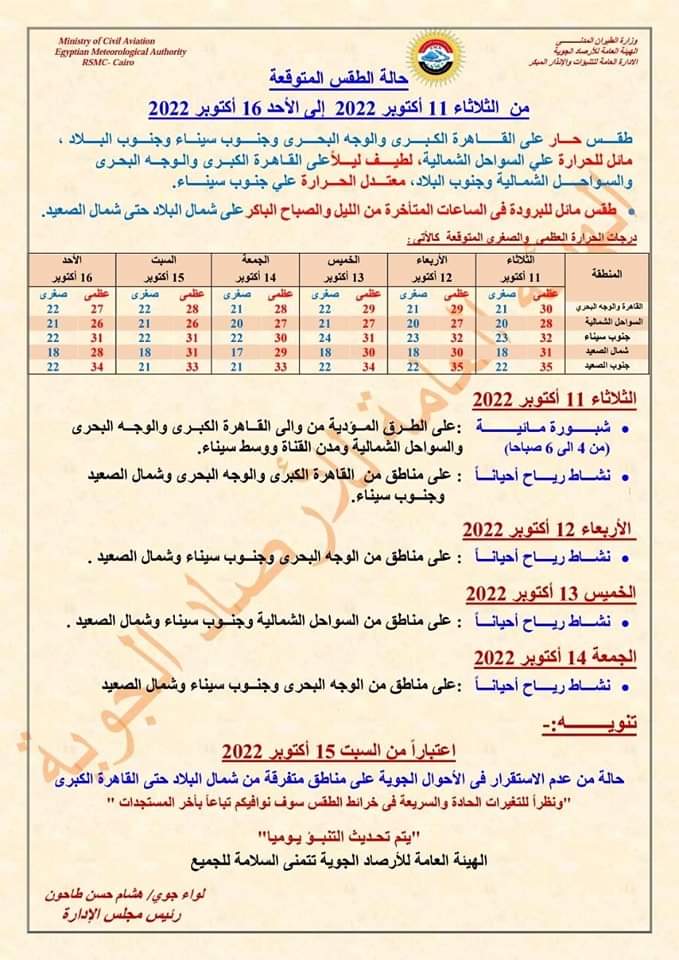 وأفادت هيئة الأرصاد الجوية، أن البلاد ستشهد حالة من عدم الاستقرار في الأحوال الجوية على مناطق متفرقة من شمال البلاد حتى القاهرة الكبرى، اعتبارا من يوم السبت المقبل، الموافق 15 أكتوبر 2022.