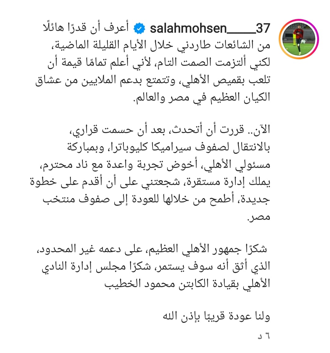 وقال صلاح محسن عبر حسابه على موقع التواصل الاجتماعي انستجرام: أعرف أن قدرًا هائلًا من الشائعات طاردني خلال الأيام القليلة الماضية، لكني التزمت الصمت التام، لأني أعلم تماما قيمة أن تلعب بقميص الأهلي، وتتمتع بدعم الملايين من عشاق الكيان العظيم في مصر والعالم.
