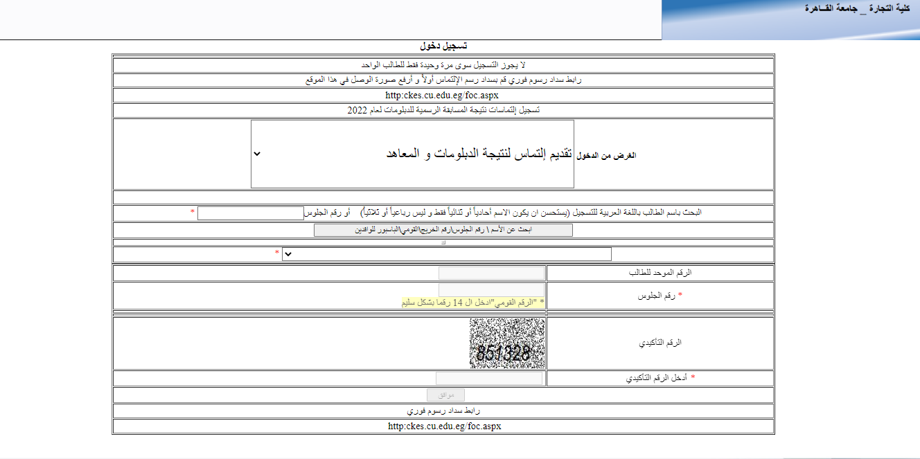 ويجب أن يعلم الطلاب أنه لا يجوز تسجيل الالتماس إلا مرة واحدة فقط، ويتم تسديد رسوم الالتماس من خلال رابط سداد فوري التي إتاحته جماعة القاهرة من هنـــــا.