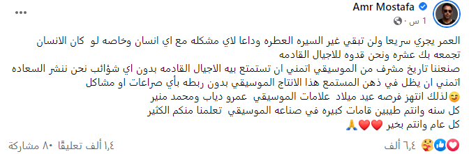 وكتب عمرو مصطفى منشورًا، عبر حسابه الشخصي بموقع التواصل الاجتماعي فيس بوك، قال فيه: العمر يجري سريعًا، ولن تبقى لنا غير السيرة العطرة، وداعًا لأي مشكلة مع أي إنسان، وخاصةً لو كان الإنسان تجمعه بك عِشرة، ونحن قدوة للأجيال القادمة.