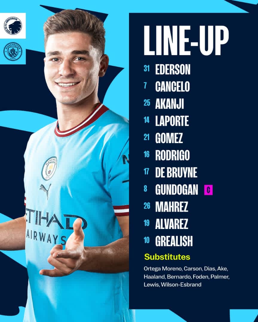 وشهد تشكيل مانشستر سيتي الإنجليزي لمواجهة كوبنهاجن الدنماركي، في دوري أبطال أوروبا، تواجد الجزائري رياض محرز في خط هجوم السيتيزن، بجانب كل من جاك جريليش وجوليان ألفاريز، في حين تواجد النرويجي إيرلينج هالاند على مقاعد البدلاء.