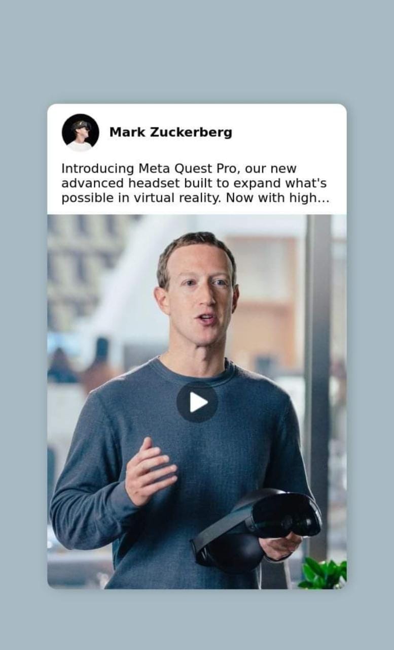 وظهر مارك في الصورة مرتديًا نضارة الواقع الافتراضي، فيما نشر فيديو مدته 36 ثانية، يوضح فيه كيفية تصنيع وعمل نظارة الواقع الافتراضي، وعلق على الفيديو: نقدم لكم Meta Quest Pro، سماعة الرأس المتقدمة الجديدة التي صممناها، لتوسيع ما هو ممكن في الواقع الافتراضي.