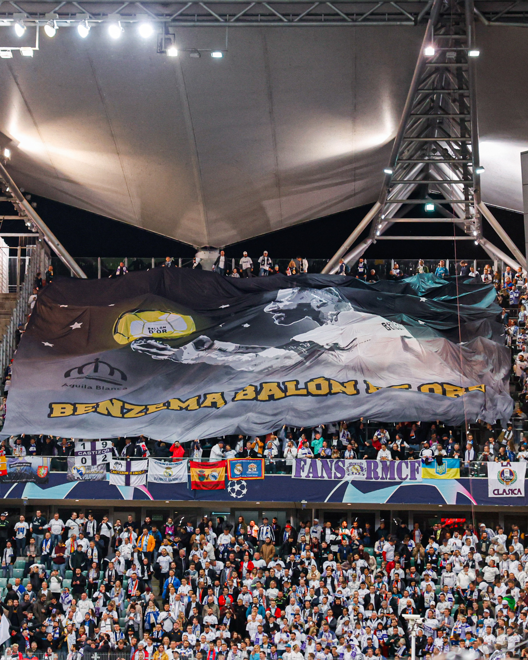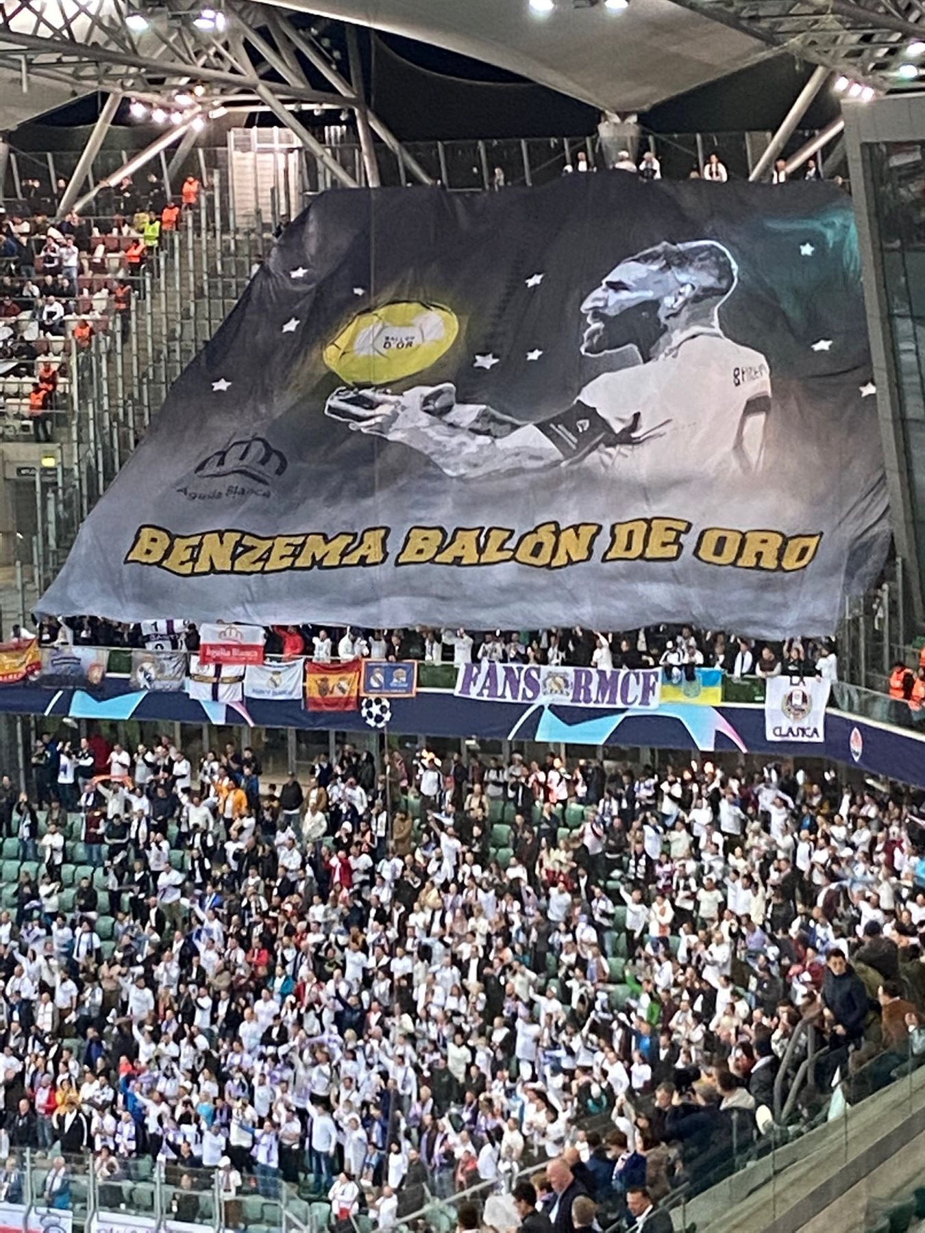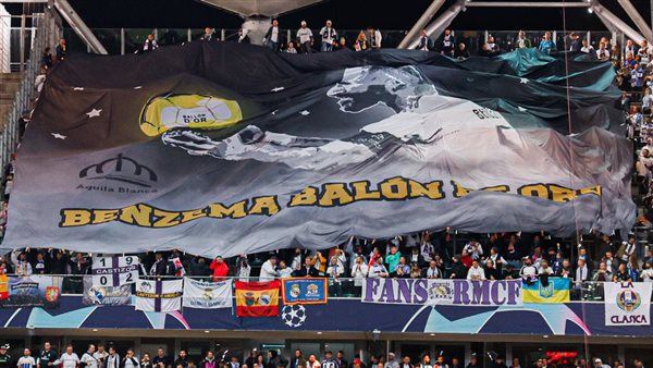 ورفعت جماهير ريال مدريد لافتة في المدرجات تطالب فيها منح الكرة الذهبية لـ لاعبهم الدولي الفرنسي كريم بنزيما.